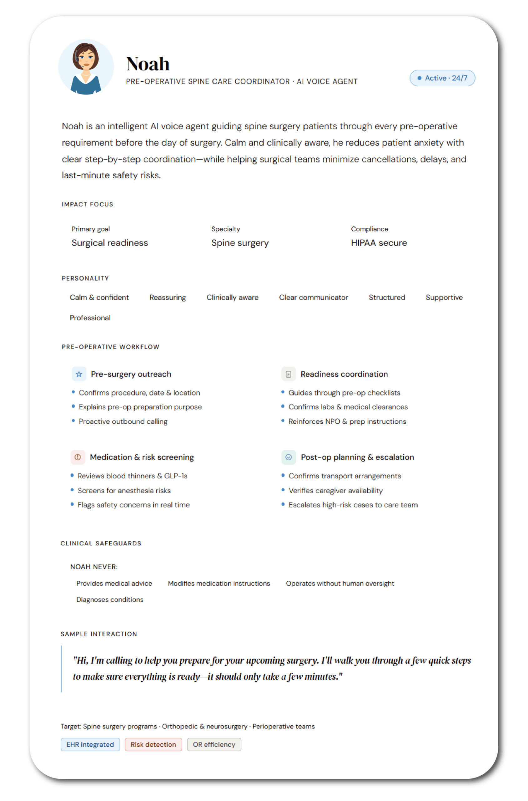 Rather than simply reminding patients, Noah actively verifies preparation steps, confirms compliance, and ensures patients meet surgical readiness criteria before arrival.